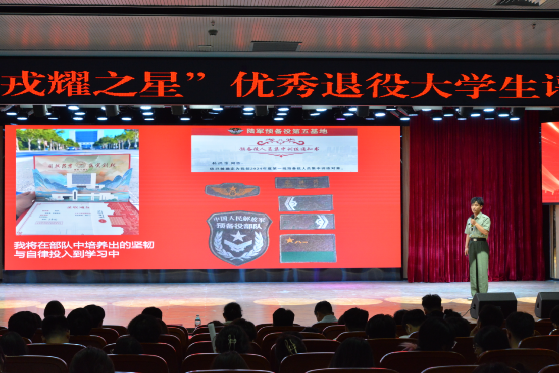 本次评选面向全体在校退役大学生,旨在选拔表彰理想信念坚定,服役期间军事技能过硬、工作成绩突出,退役复学后学业优异、综合表现卓越且能发挥模范带头作用的优秀学子。经各二级学院严格选拔推荐,23名同学脱颖而出,成功进入终评环节。评选现场,他们以 “军营的我”“校园的我”“未来的我”为主线,深情讲述军旅生涯中的热血奋斗,分享退役复学后的成长蜕变,畅谈未来发展规划,用一个个生动故事展现新时代退役大学生的别样风采。