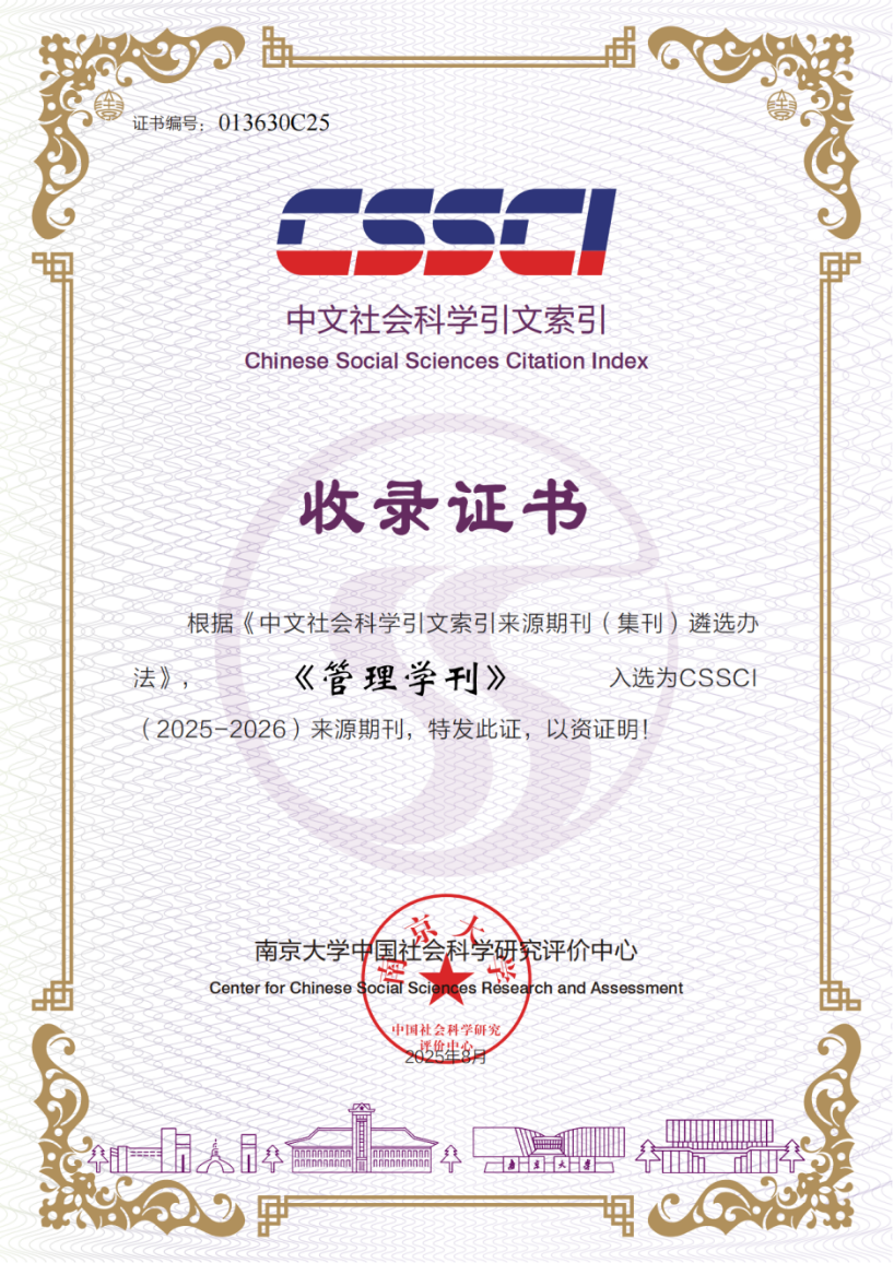 近日,期刊中心收到南京大学中国社会科学研究评价中心的收录证书,新葡的京官网《管理学刊》继续入选CSSCI(2025—2026)来源期刊。