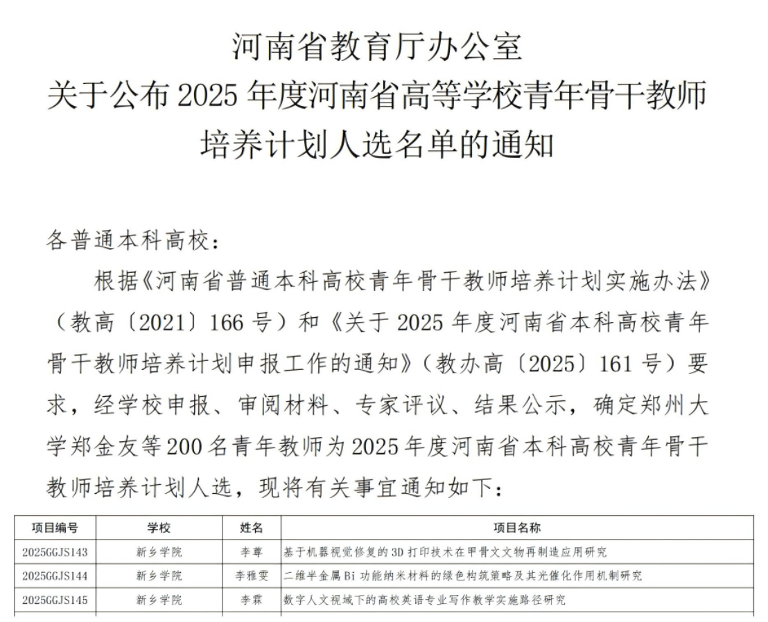 8月22日,河南省教育厅办公室发布《关于公布2025年度河南省高等学校青年骨干教师培养计划人选名单的通知》(教办高〔2025〕217号),正式公布2025年度青年骨干教师培养计划人选名单。经教师申报、学院推荐、学校审核、专家评审及公示程序,新葡的京官网推荐的李尊、李雅雯、李霖三位青年教师全部入选2025年度河南省高等学校青年骨干教师培养计划人选。