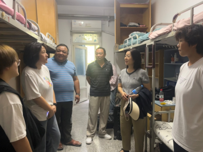 迎新期间,副校长韩辉、体育学院党委书记刘瑜、副书记黄远伟及2025级新生辅导员张晨曦一行来到体育学院迎新现场和新生宿舍检查指导工作,慰问新生及志愿者。在走访宿舍时,校领导与新生及家长进行了亲切交流,细致询问了他们的到校感受、行程安排及生活需求,并简要介绍了学校基本情况,叮嘱工作人员要热情、细致、周到地做好服务工作,让家长放心,让学生暖心。