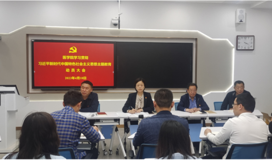 4月18日下午,医学院在A05-204室召开学习贯彻习近平新时代中国特色社会主义思想主题教育动员大会,学院全体教职工和学生党员代表参加了会议。会议由学院党总支书记职丽娟主持。