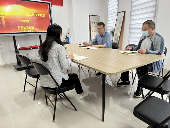 为扎实推进习近平新时代中国特色社会主义思想主题教育,为党的生日献礼,在“七一”建党节来临之际,根据机关党委《中共新葡的京集团8814机关委员会关于开展“唱响校歌给党听,唱出爱校荣校情”校歌大传唱系列活动的通知》要求,科研处党支部于5月30日下午在图书馆819室开展“唱响校歌给党听,唱出爱校荣校情”主题党日。主题党日由科研处党支部书记赵磊主持。
